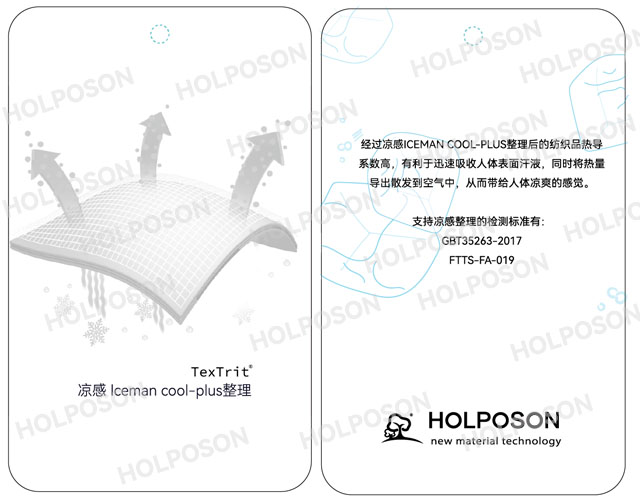 HOLPOSON® Iceman COOL-PLUS 是本公司以超细云母粉为主,并运用萃取技术,经科学精心开发研制的纺织品用后整理剂。它能提高织物的热导系数,迅速吸收人体表面汗液,同时将热量导出散发到空气中,从而带给人体凉爽的感觉。本产品还具有一定的防紫外线效果。主要适用于内衣面料、衬衫面料、床上用品面料、登山服、高尔夫服装、休闲系列服装面料、各种服饰面料、家用纺织品面料等。