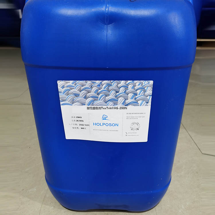 酸性固色剂ColTrit®HS-250N属于磺酸缩合物聚合而成,可与染料构成不溶于水的大分子化合物,从而提高染色物的耐水洗及摩擦等各项牢度,是羊毛﹑尼绒﹑锦纶﹑丝绸﹑皮件等用阴离子染料(酸性染料,金属络合染料)染色之纤维的专用固色剂,经处理后的染色物,其皂洗牢度、水洗牢度、汗渍牢度、耐氯牢度等得到极大提高,免调酸,使用方便。